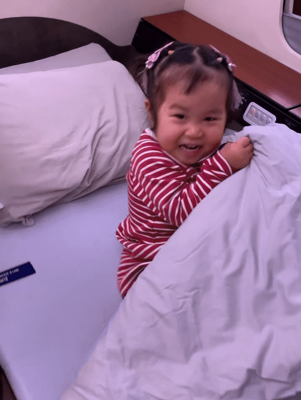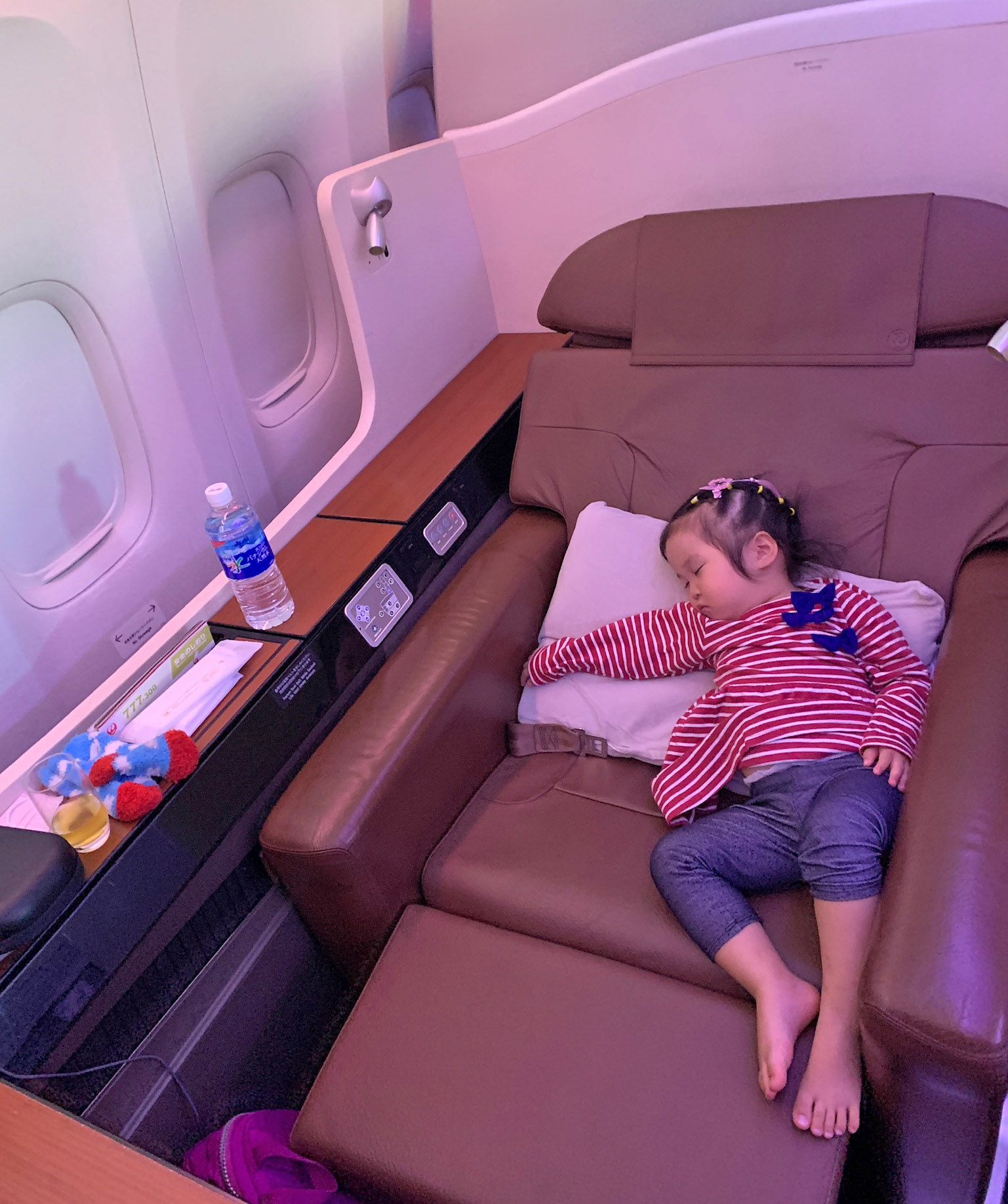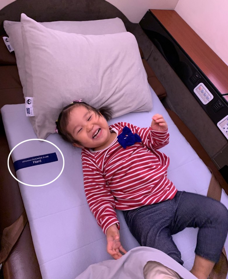 After eating yum yum, mommy said it was time for night night. Japan Airlines lets us custom the firmness of the mattress! Mommy usually likes mattress on “hard”.