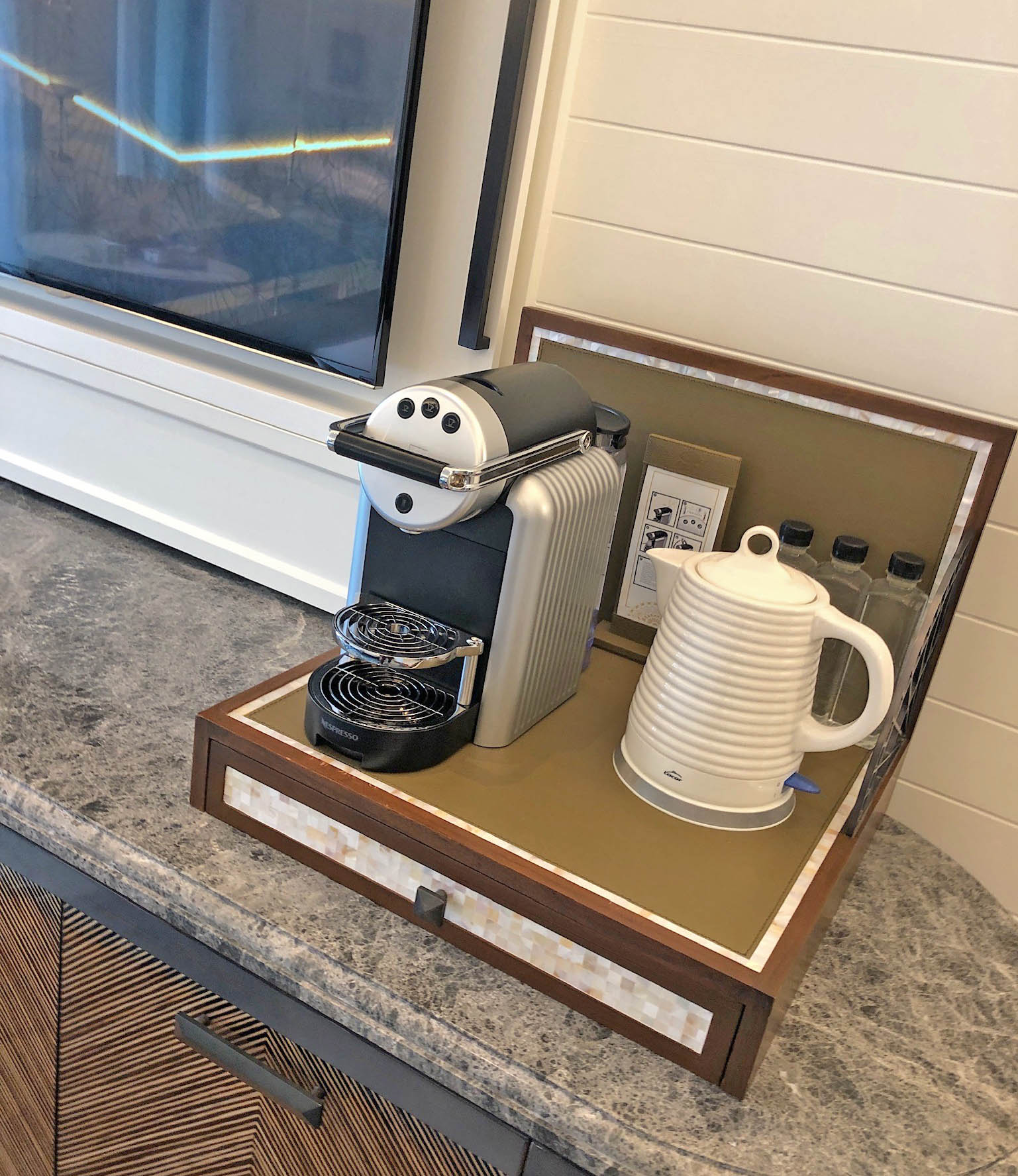 The room comes with a Nespresso Vertuo machine and a porcelain teapot. Careful with the teapot, the porcelain is very very expensive & fragile.