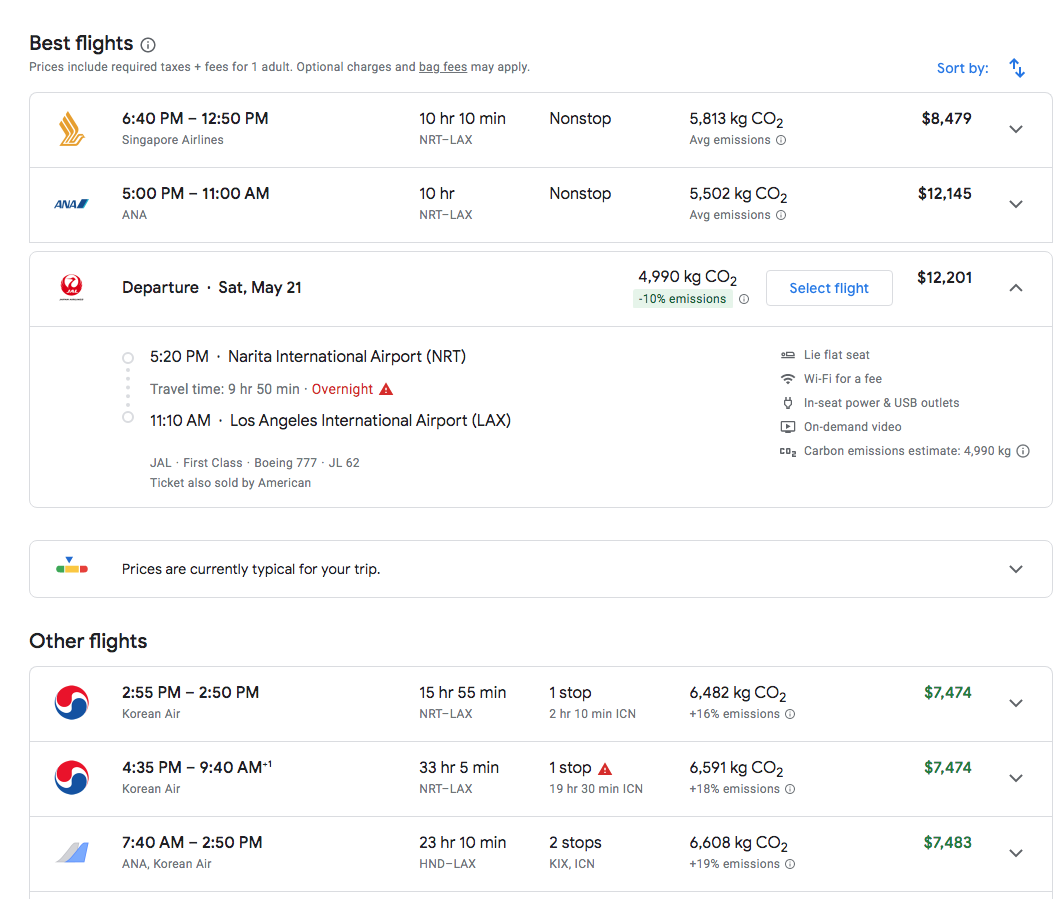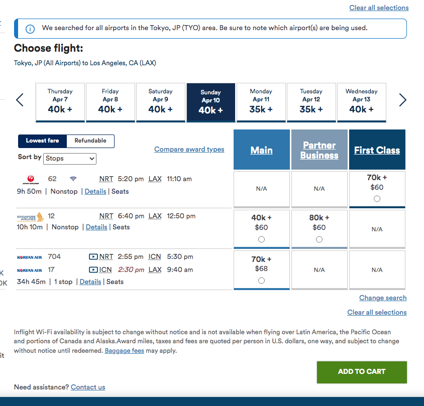 Notice for the exact same 70k miles… Korean Air is only economy (absurd)