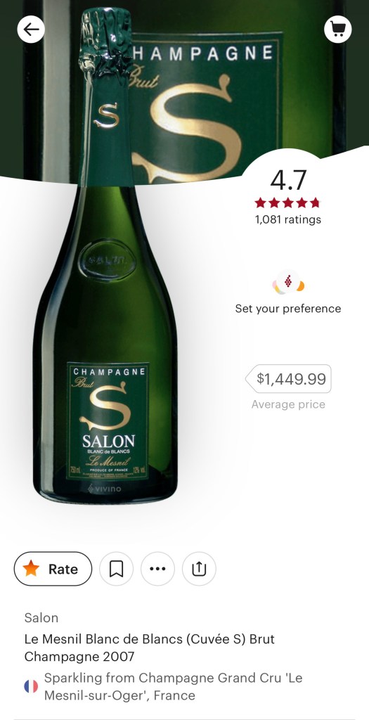 For price point comparisons, here are the bottles side by side. The Cristal Vintage 2013 retails ~$350+ USD while the Salon Vintage 2007 retails for a jaw-dropping ~$1000+ USD. Both are exceptional wines.