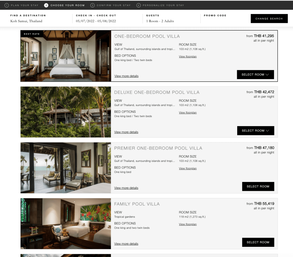 No way around this. Since this property doesn’t have its own loyalty program, the best way to book this is through cash. With Thailand officially reopened, the prices in May 2022 are eye gouging. Including resort taxes/fees, an entry pool villa starts at 40,000 baht per night, which is well over $1000 USD.