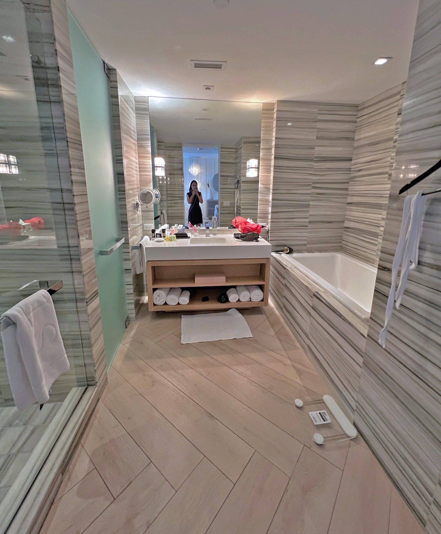 To her surprise, Miki got proactively upgraded three levels up to the “Oasis Suite“. This is a massive jump in terms of room size and amenities. Spanning at over 1100 sq-ft, it’s a luxury condo style design featuring…