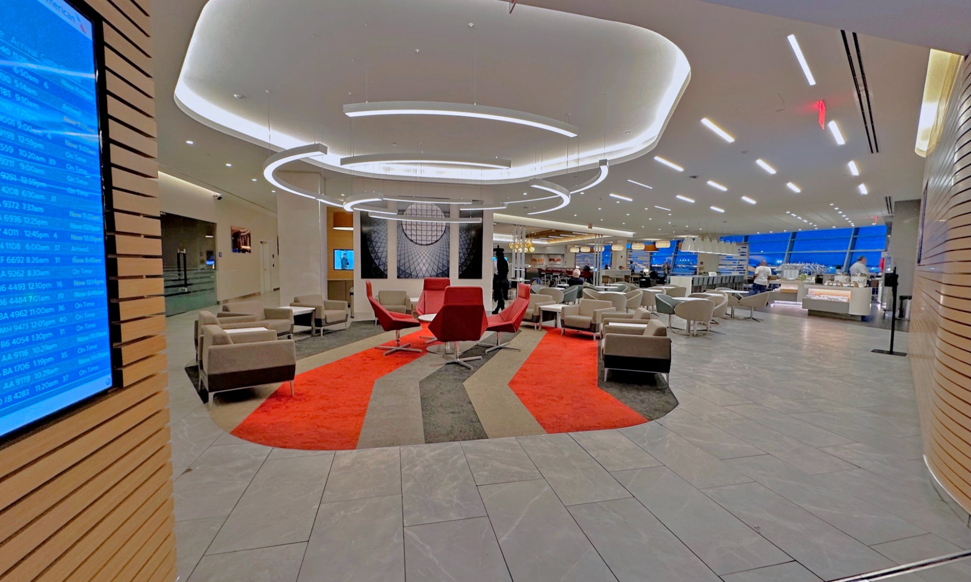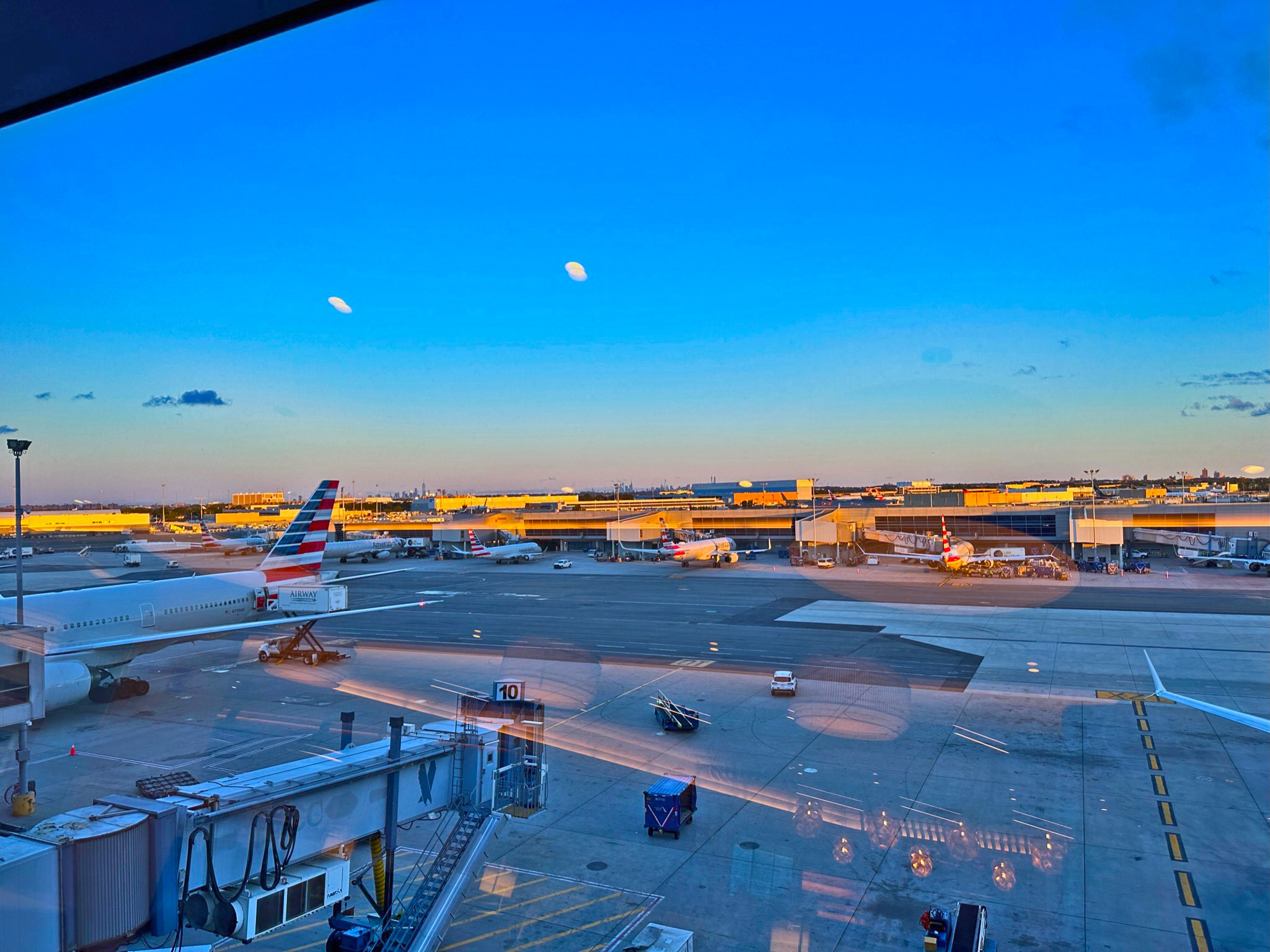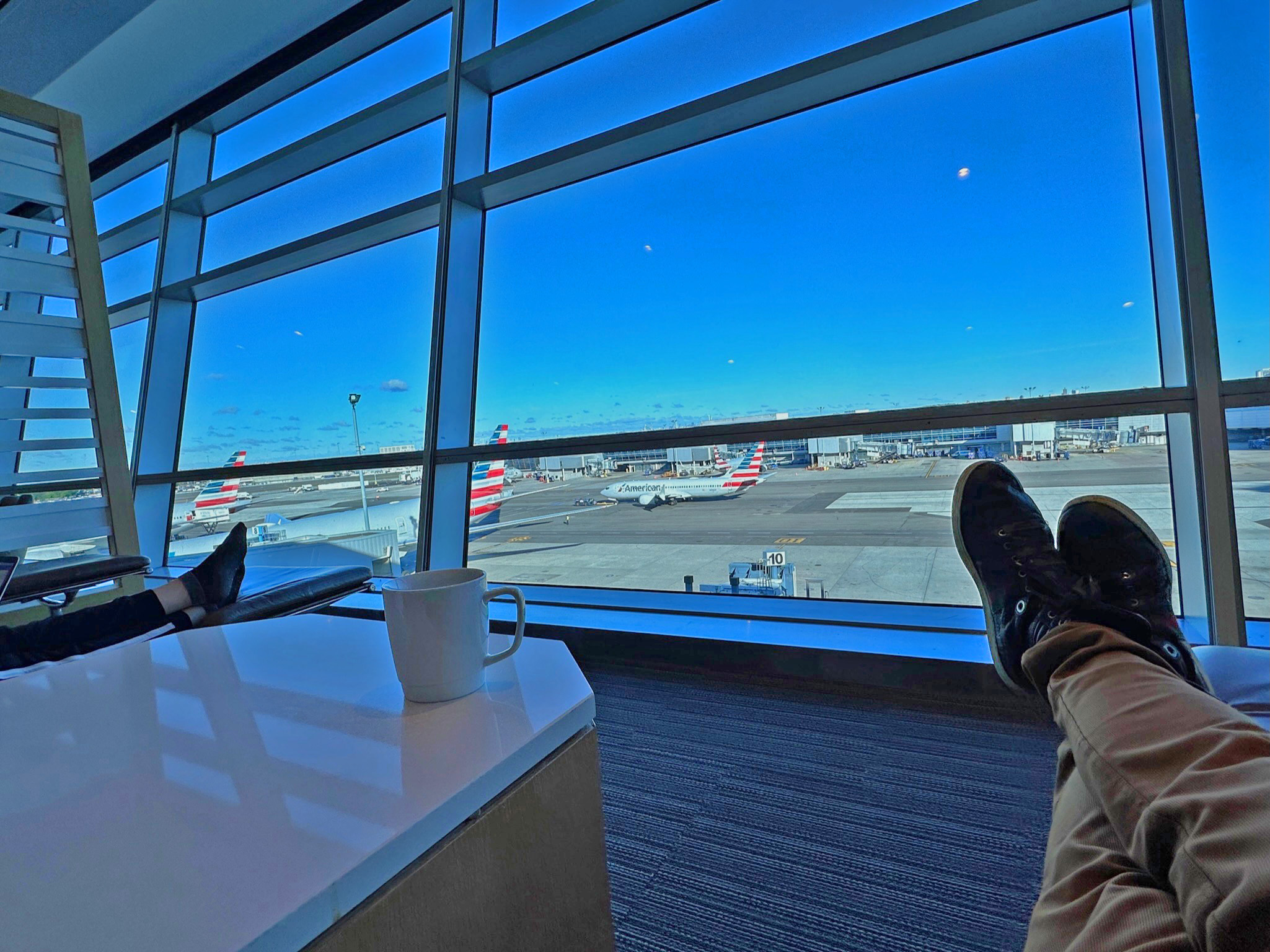 For a view, there’s a whole floor-to-roof glass panel with pretty views of American Airline’s JFK Terminal 8.