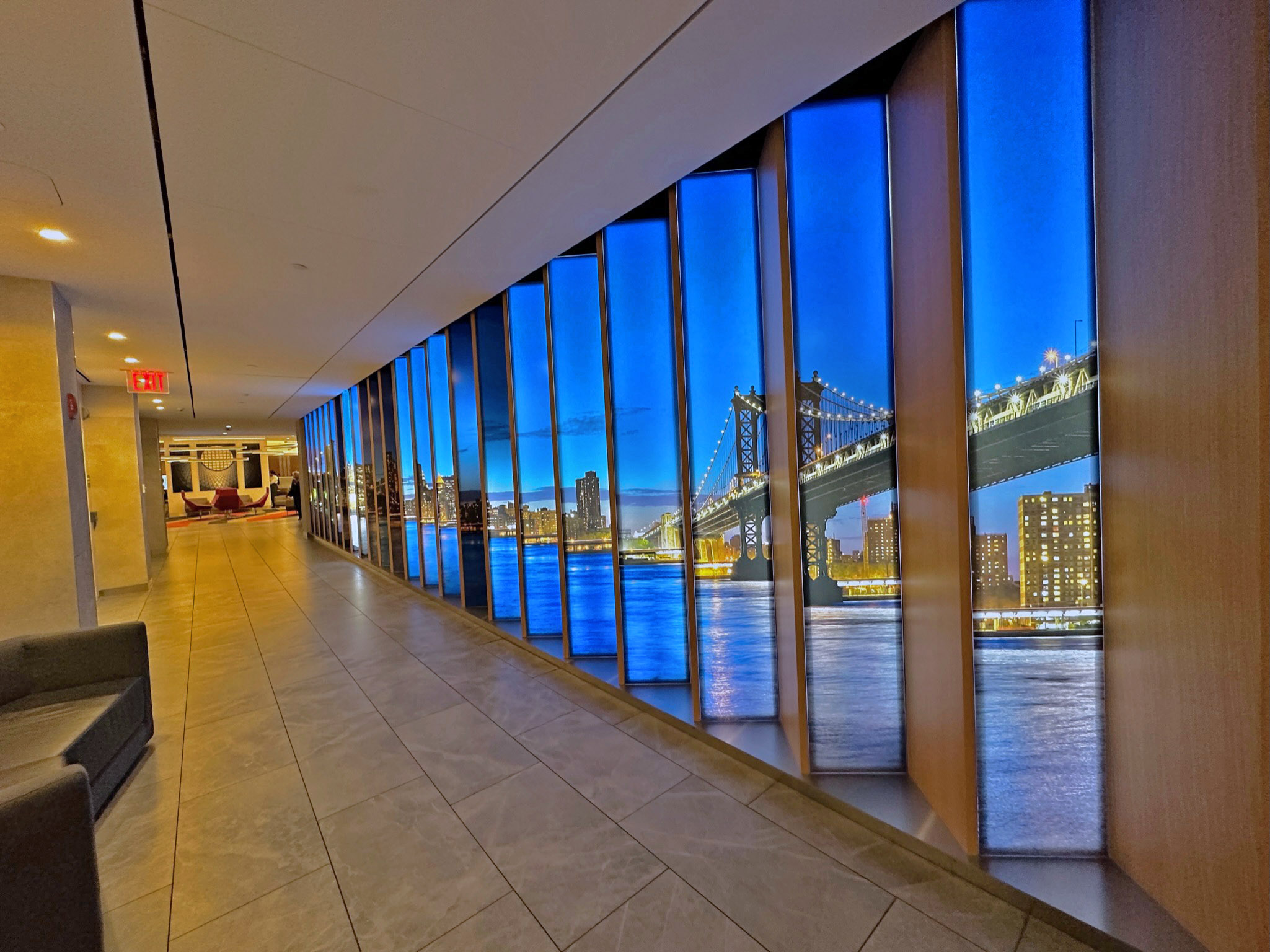 After scanning your boarding pass on the mezzanine level, there’s a long entrance way into the lounge that features a panoramic New York skyline.