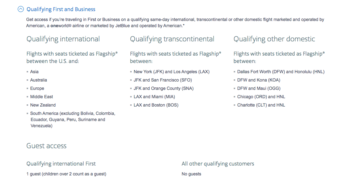 For most readers, the best way to get access to American Airline Flagship Lounges is by booking a qualifying transcontinental and/or international flight. Below is the general access routes that grants access.