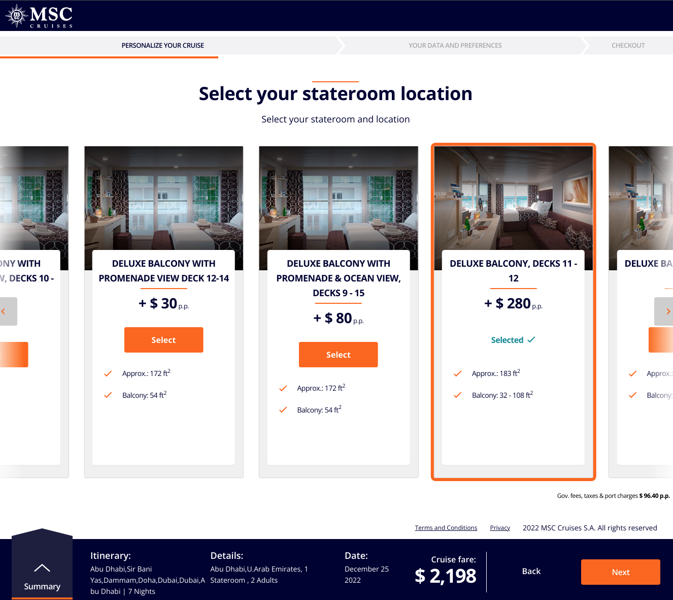 Within the “Balcony” category, we chose the “Deluxe” for the location which adds $280 USD more, which makes it $1099 per passenger for the stateroom.