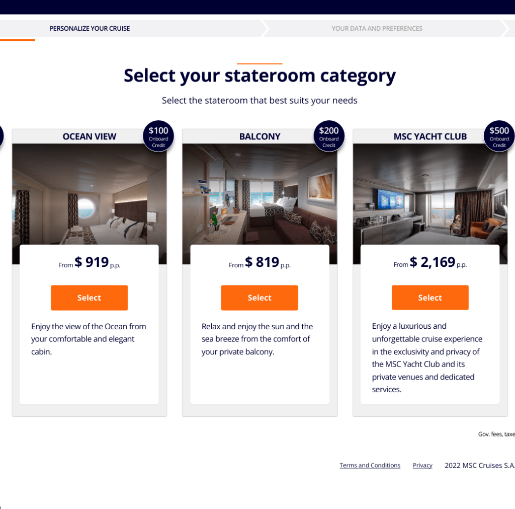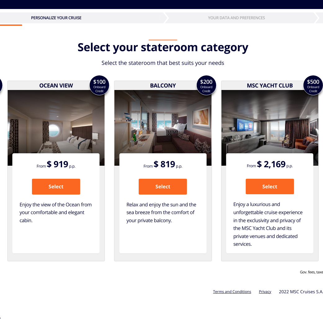To book the cruise, you select the stateroom that you like. For most of us, we chose the “Balcony” category, which starts at $819 USD per passenger.