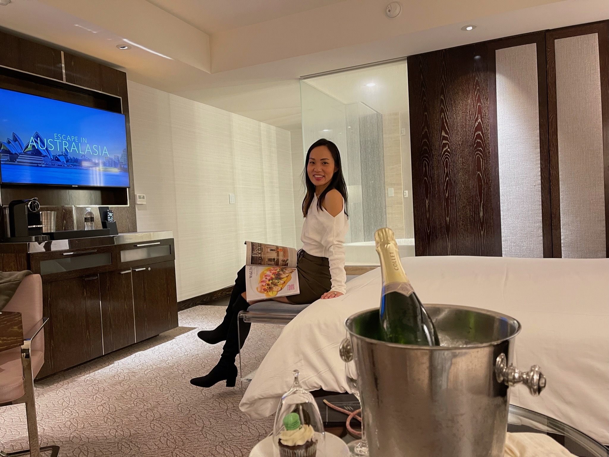 The layout is similar to Mandarin Oriental with subtle brighter hue/tones added to the room. Another surprise is that they had a bottle of Collet champagne at the coffee table. A nice welcome touch.