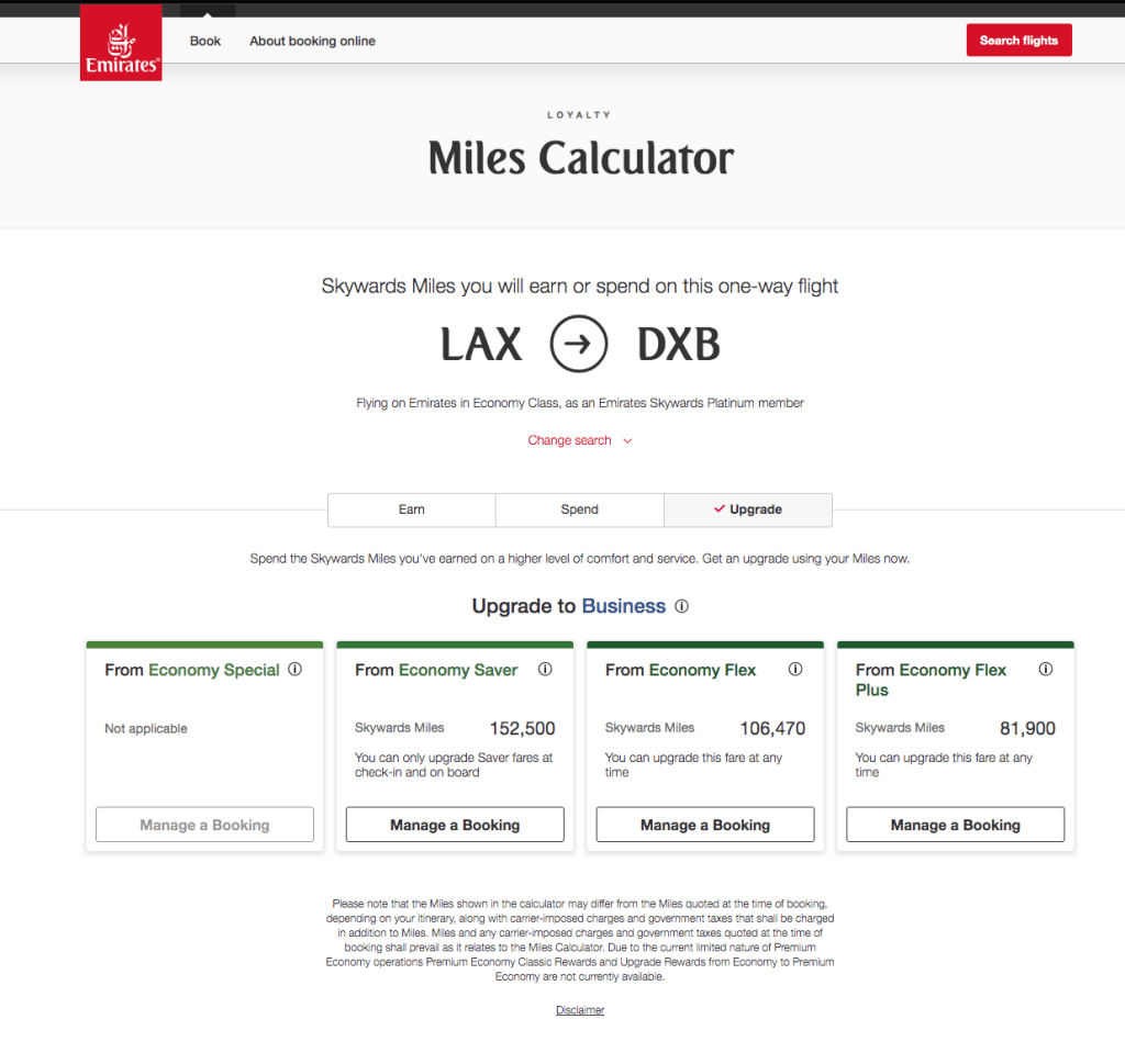 In our case, the Emirates Flex Plus fare turned out to be $1000 USD one-way, which is just a tad more than the $838 USD fuel surcharges. But as you can see, the cost to upgrade is only 81,900 miles instead of 157,500 miles.