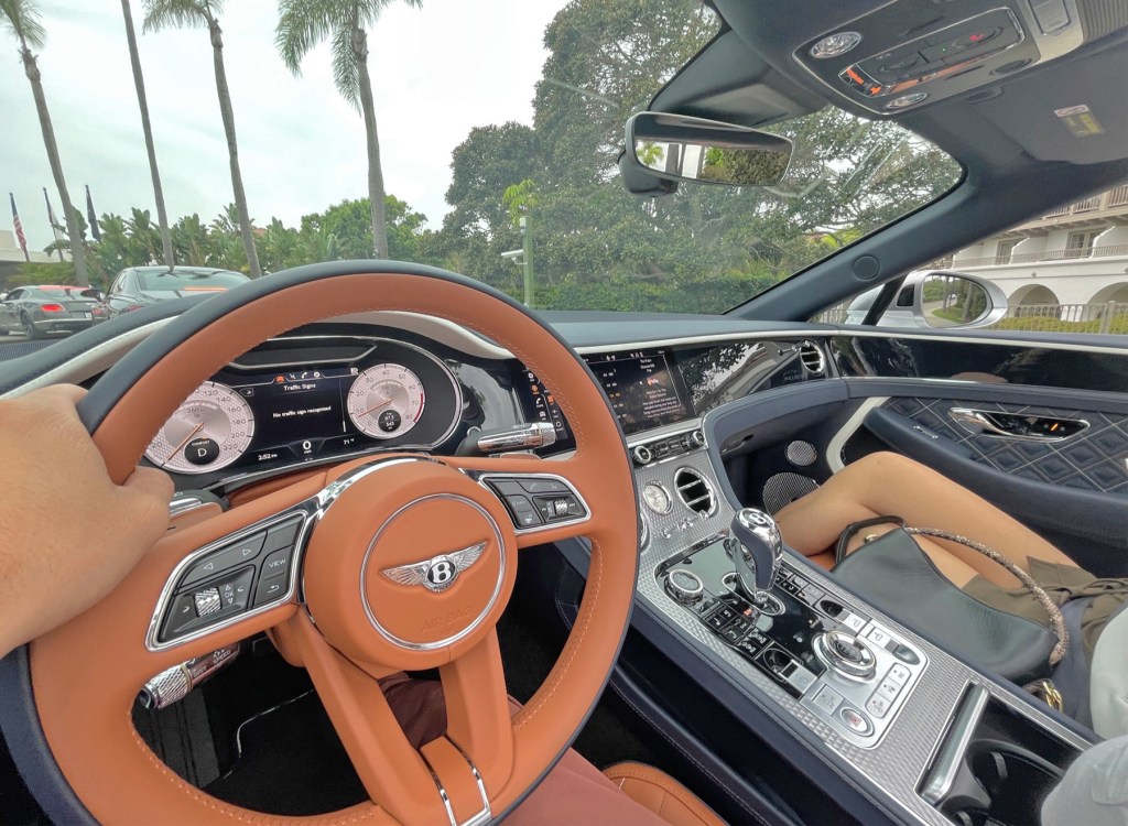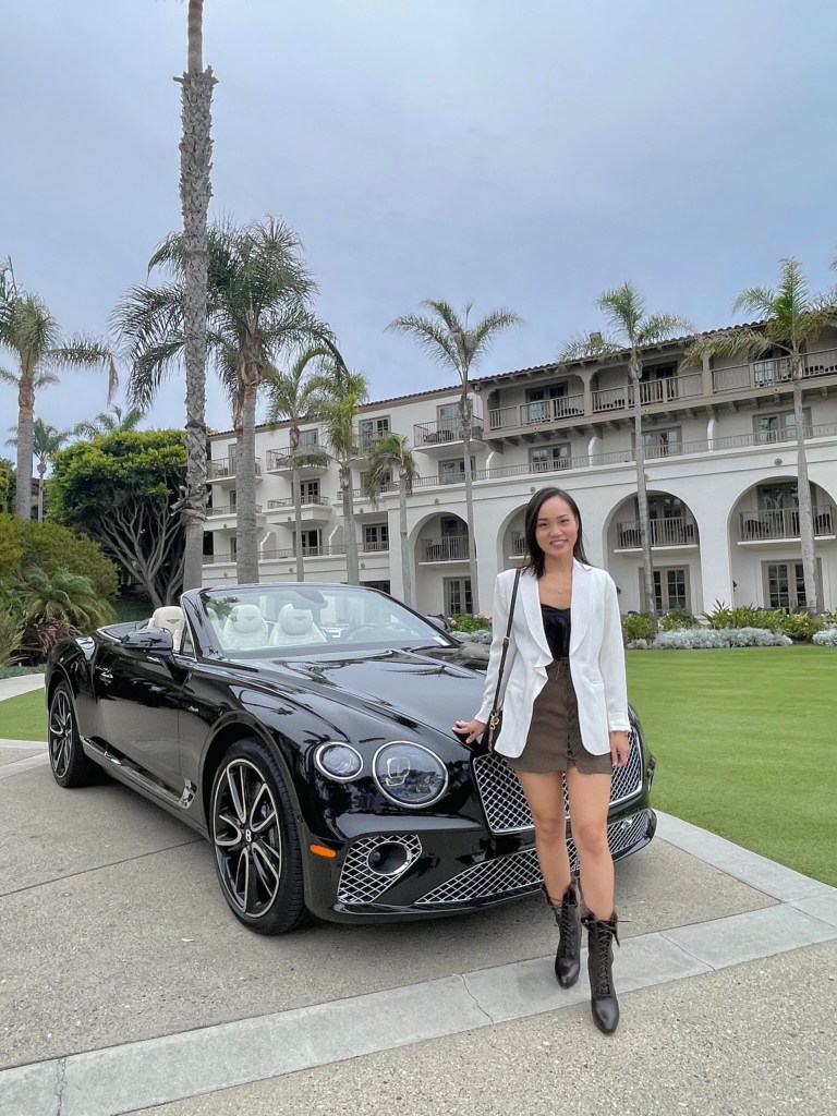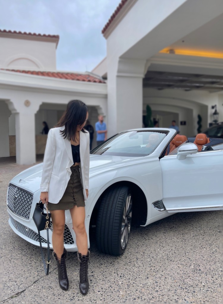 For the second Bentley, we decided to go California style and sample the Mulliner Convertible. What makes this Bentley so special is that the interiors are full of ultra-luxe custom features (i.e. champagne fridge, sound system, stone veneers, diamond leather, etc.) which makes the vehicle one of a kind to your liking. It is built not only for the driver… but for passengers wanting to enjoy the highest level of comfort in a car. When the white beast pulled up at the valet, Miki looked like she was right at home.