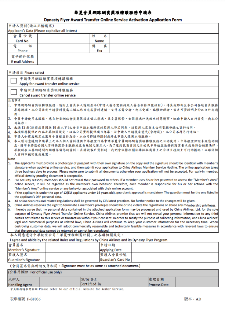 This process almost feels purposefully convoluted, but hang with me… it’s worth the pain. For passengers that want the ability to transfer their miles directly online, you have to fill in this paper form and submit it to China Airlines.