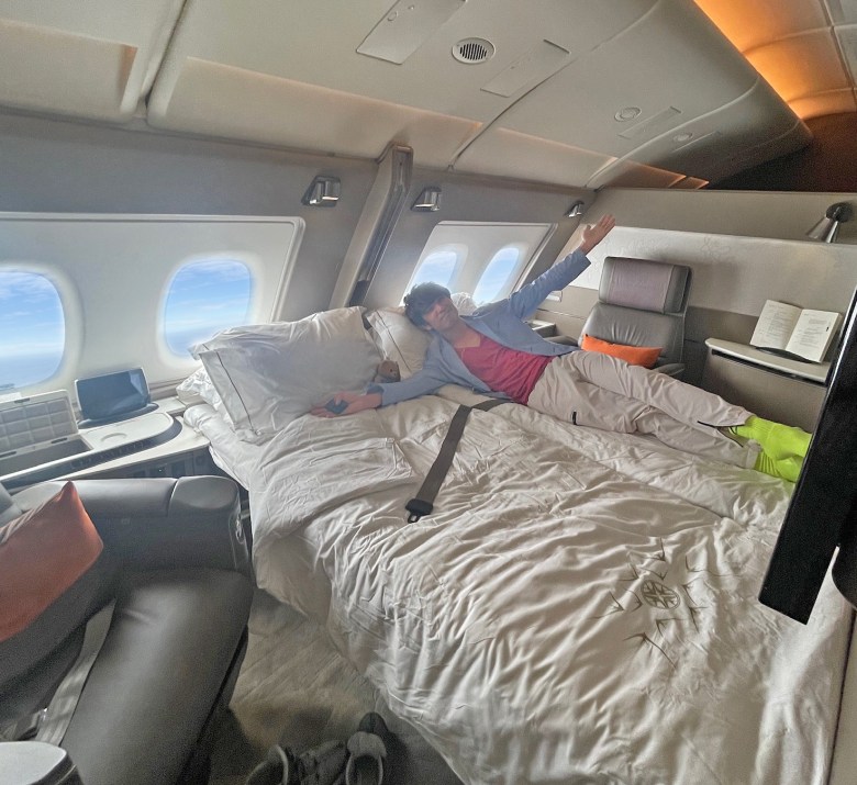 If you get lucky and there’s no one in First Class, you can ask the flight attendant to make the bed next to you to take up the entire cabin.