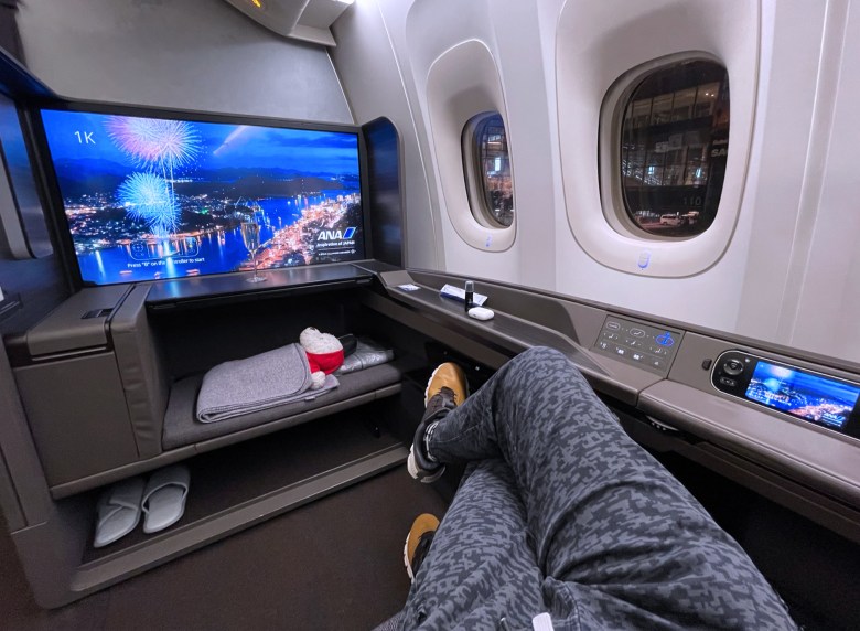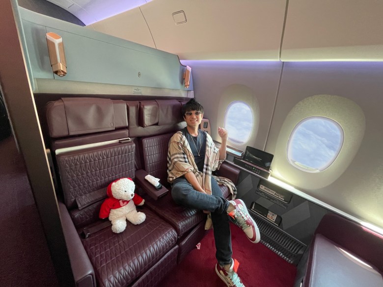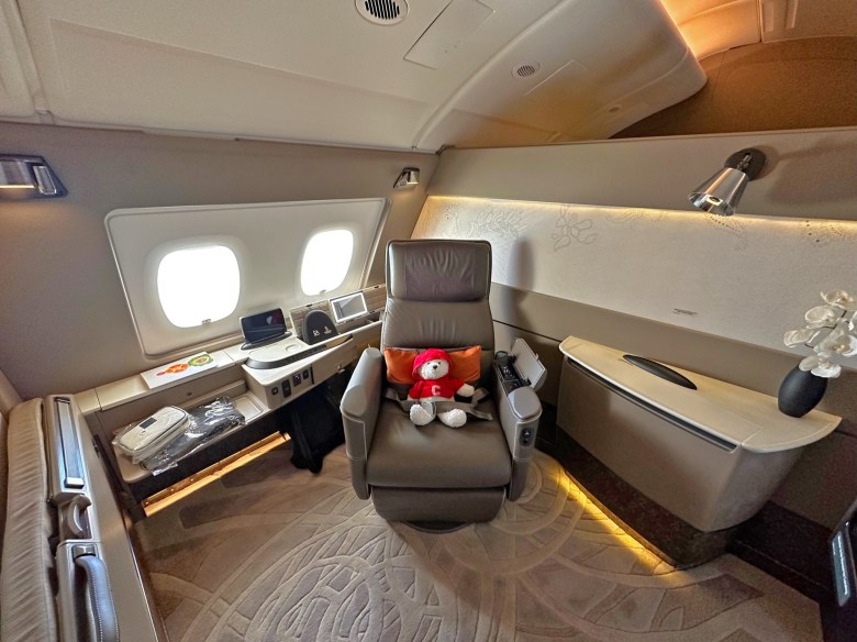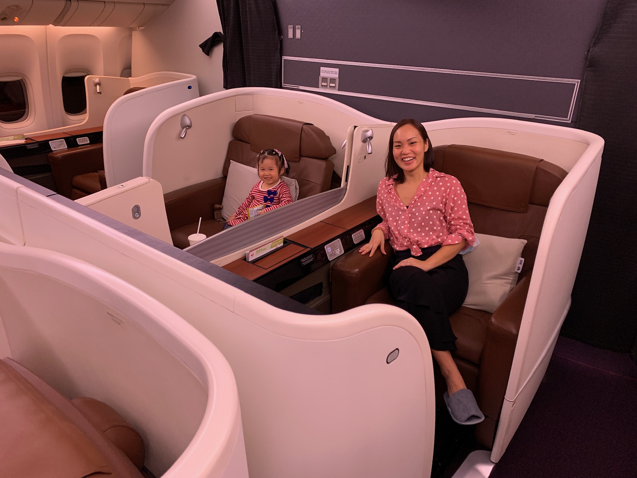 This flight honestly felt like Christmas morning. Just by chance, I did a speculative booking and the stars happen to align with our travel schedule. This new generation of Japan First Class is everything the original one has plus cabin upgrades. It is designed for 3 passengers — even Chai Bear gets his own seat