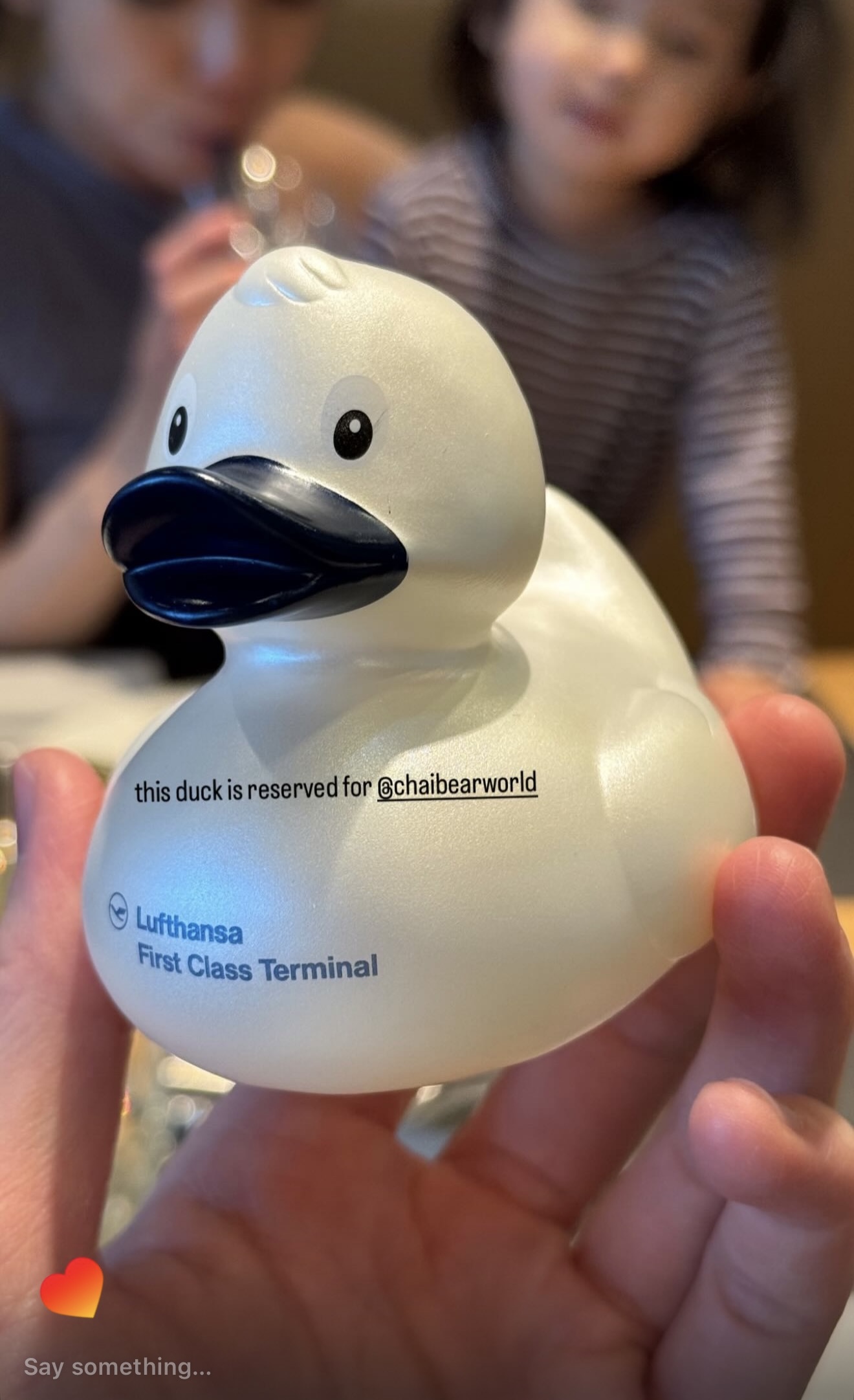 Another variable to consider is if your origin/transit is in Munich or Frankfurt. For example if you are departing in Munich, you will get a cute baby duck that is about half the size of Lufthansa First Class Terminal. Thus depending on what type of duck you want to get, you may need to strategically choose which city in Germany you want to fly from. For size comparison, here it is side by side on the backs of the adult ducks 🦆