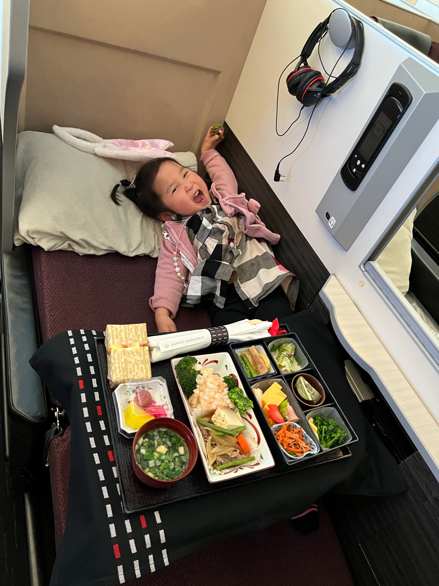 The yummiest airline in the world if you like Japanese food! The airline has a convenient staggered apex seat which makes it easy for little kids since they have a nook to roam around.